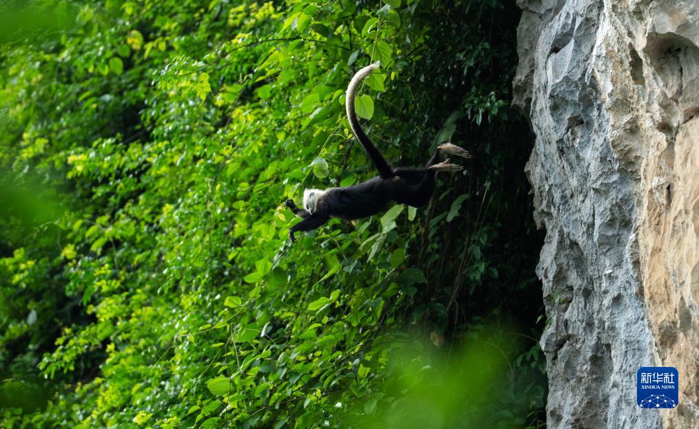 一只白頭葉猴從懸崖上躍向樹林(8月5日攝)。
