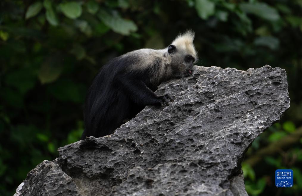 白頭葉猴,頭頂高聳著一撮白毛,是我國特有的國家一級重點保護野生動物,種群數量稀少,主要分布在廣西崇左市左江和明江之間約200平方公里的喀斯特石山地區。白頭葉猴還有個好聽的名字——“石山精靈”。