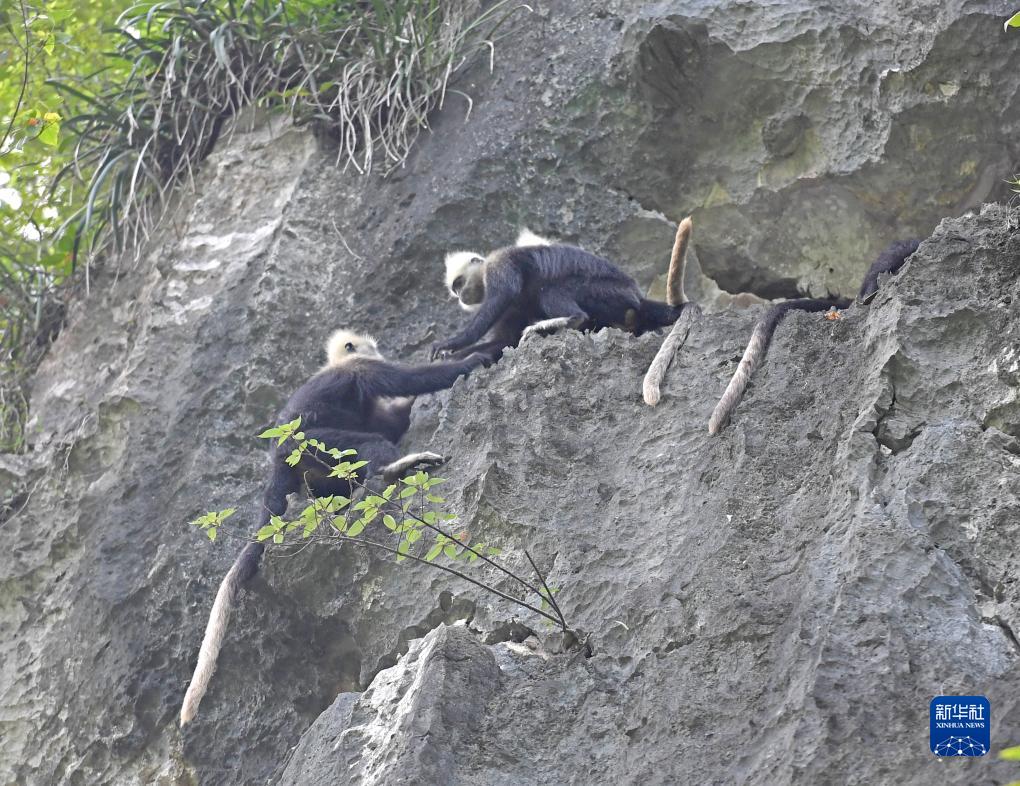 白頭葉猴,頭頂高聳著一撮白毛,是我國特有的國家一級重點保護野生動物,種群數量稀少,主要分布在廣西崇左市左江和明江之間約200平方公里的喀斯特石山地區。白頭葉猴還有個好聽的名字——“石山精靈”。