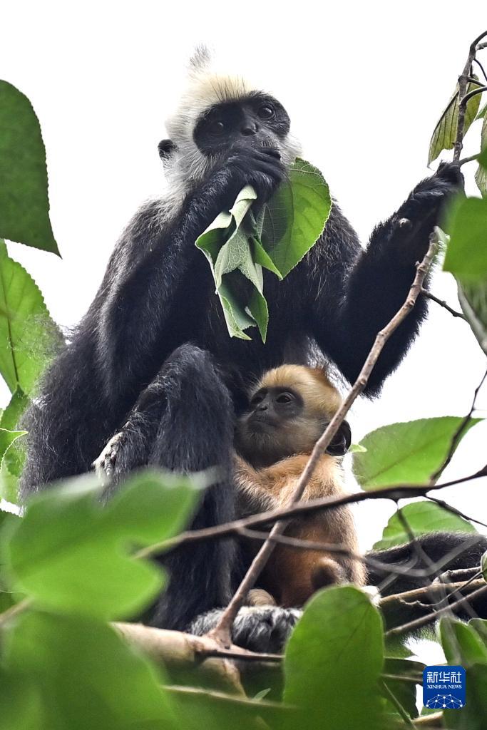 一只白頭葉猴帶著幼猴覓食(8月4日攝)。