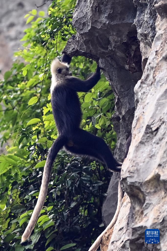 白頭葉猴,頭頂高聳著一撮白毛,是我國特有的國家一級重點保護野生動物,種群數量稀少,主要分布在廣西崇左市左江和明江之間約200平方公里的喀斯特石山地區。白頭葉猴還有個好聽的名字——“石山精靈”。