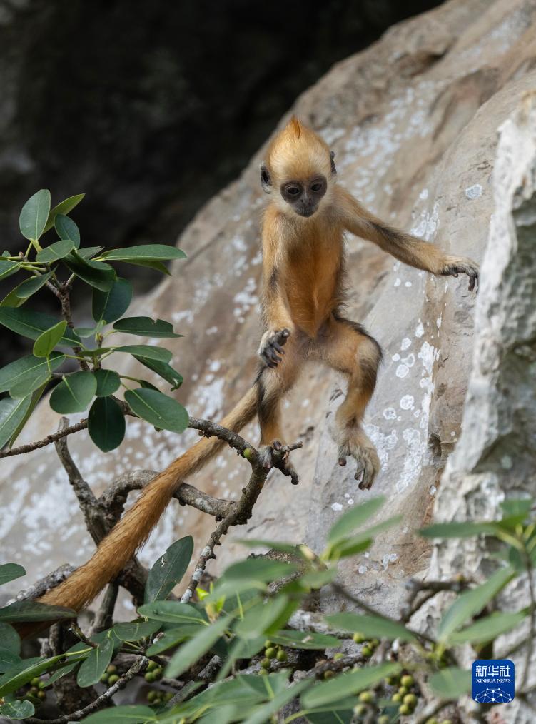 白頭葉猴,頭頂高聳著一撮白毛,是我國特有的國家一級重點保護野生動物,種群數量稀少,主要分布在廣西崇左市左江和明江之間約200平方公里的喀斯特石山地區。白頭葉猴還有個好聽的名字——“石山精靈”。