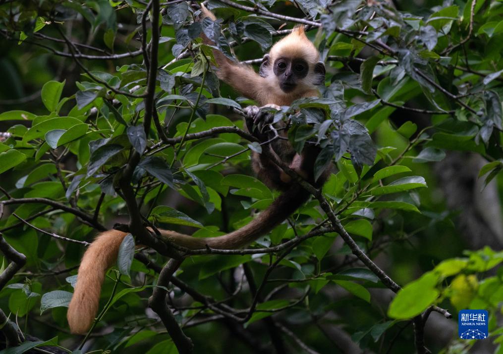 一只白頭葉猴幼猴在樹上張望(8月5日攝)。