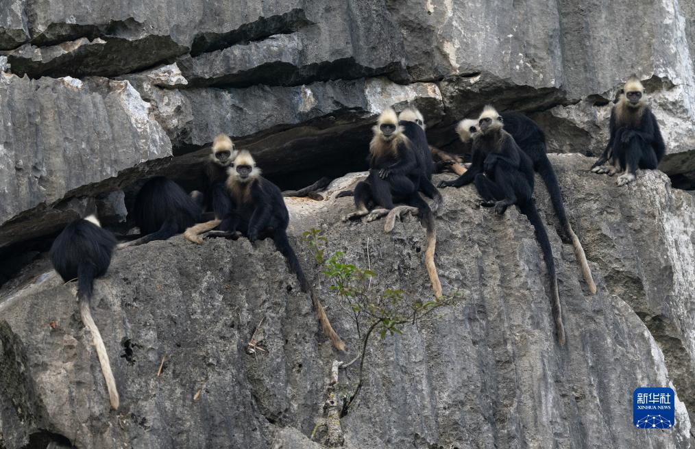白頭葉猴,頭頂高聳著一撮白毛,是我國特有的國家一級重點保護野生動物,種群數量稀少,主要分布在廣西崇左市左江和明江之間約200平方公里的喀斯特石山地區。白頭葉猴還有個好聽的名字——“石山精靈”。