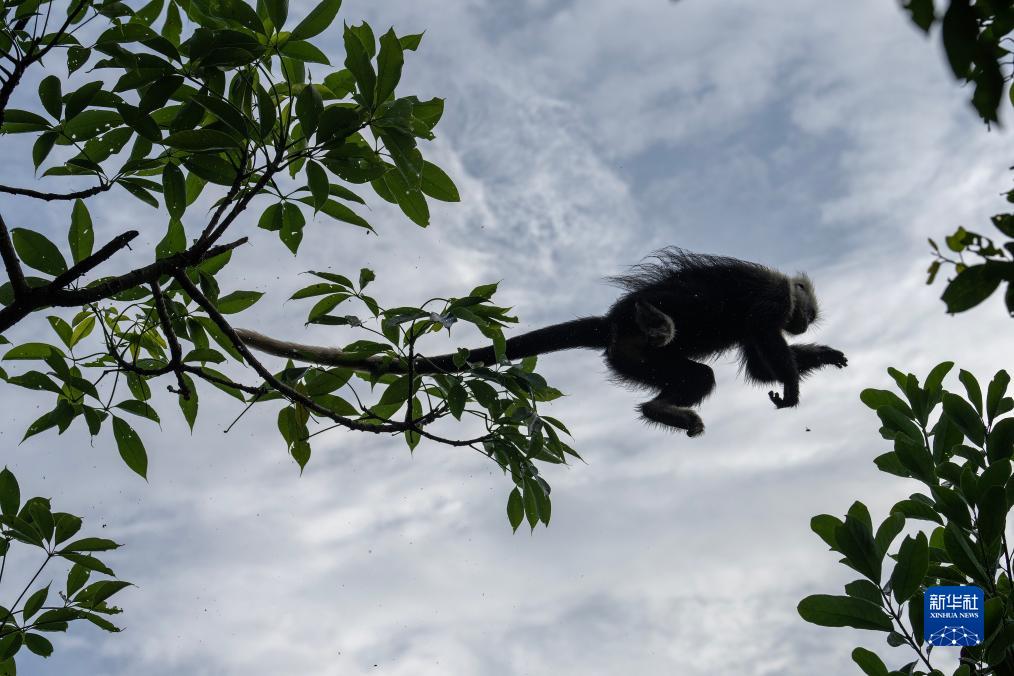 一只白頭葉猴在林間跳躍(8月5日攝)。