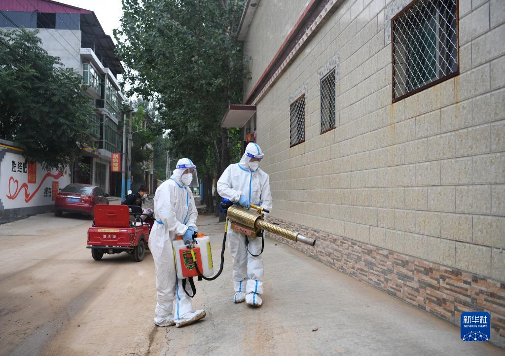 8月6日,在河北省涿州市刁窩鎮白塔村,志愿者在民房前進行消殺作業。