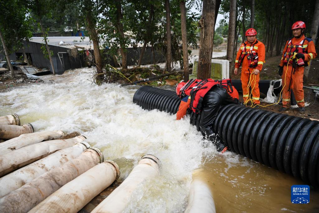 8月6日,在河北省涿州市刁窩鎮東張村,唐山消防救援支隊隊員在進行排澇作業。