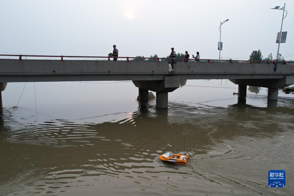海委水文局水文應急監測小分隊在大清河上測流作業(8月4日攝,無人機照片)。