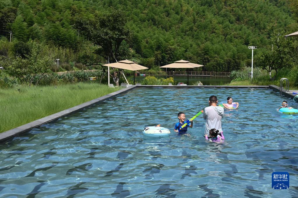 8月6日,小朋友在浙江省安吉縣山川鄉大里村一家民宿酒店的泳池戲水。