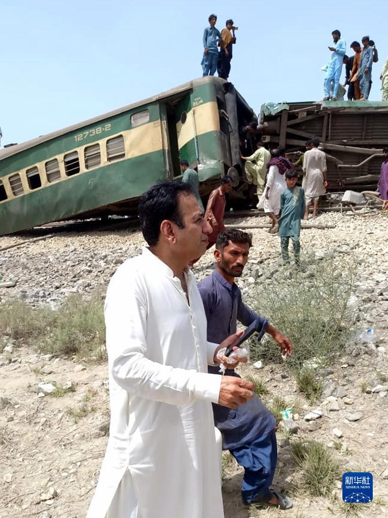 8月6日,在巴基斯坦南部信德省??藸柕貐^,人們從脫軌的列車旁走過。