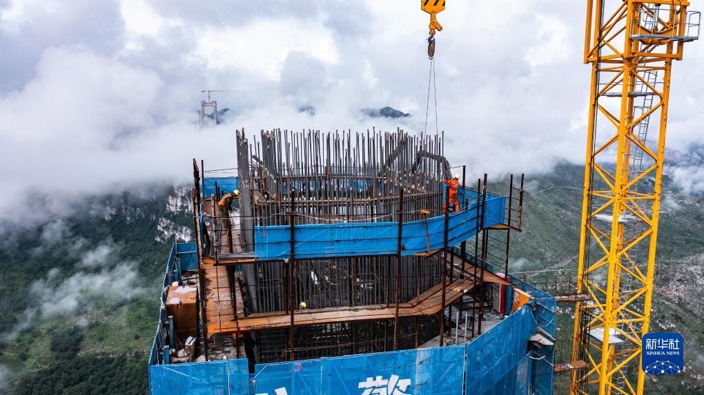 貴州公路集團工人在花江峽谷大橋5號主塔進行施工(8月3日攝,無人機照片)。