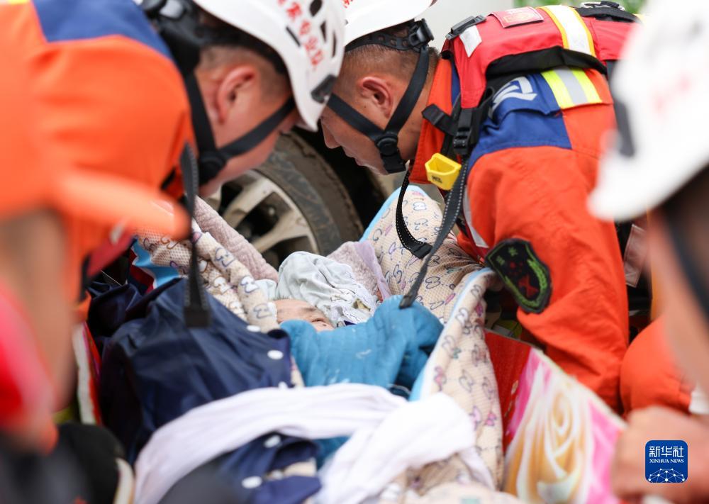 8月6日,吉林市消防救援支隊隊員將曲鳳霞移送至安全地帶。