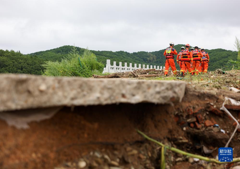 8月6日,吉林市消防救援支隊隊員徒步穿過坍塌的橋梁前往受困人員位置。