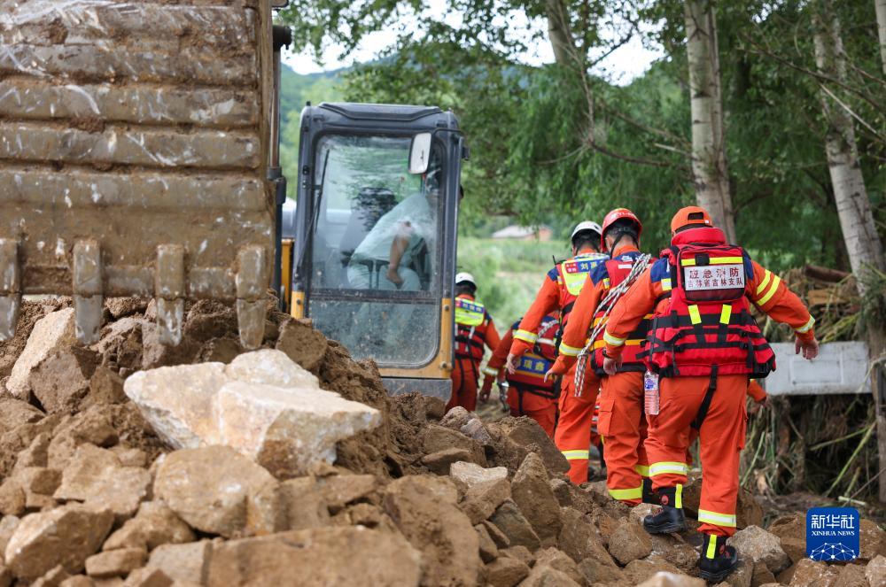 8月6日,吉林市消防救援支隊隊員徒步穿過坍塌的道路前往受困人員位置。