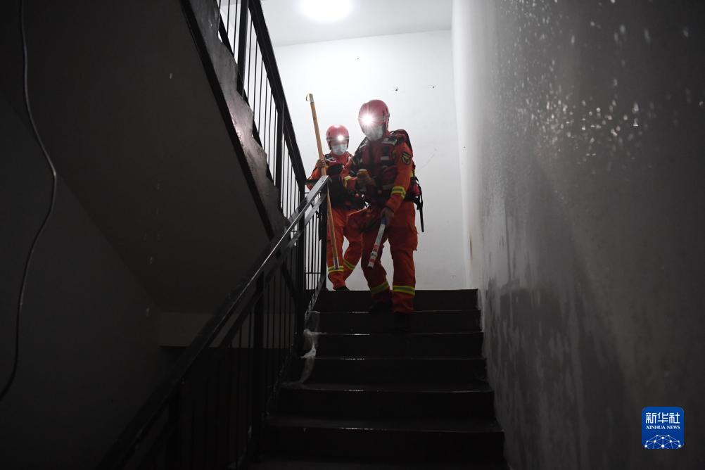 8月7日,邢臺市消防救援支隊隊員在河北省涿州市一處寫字樓地庫查看積水情況。