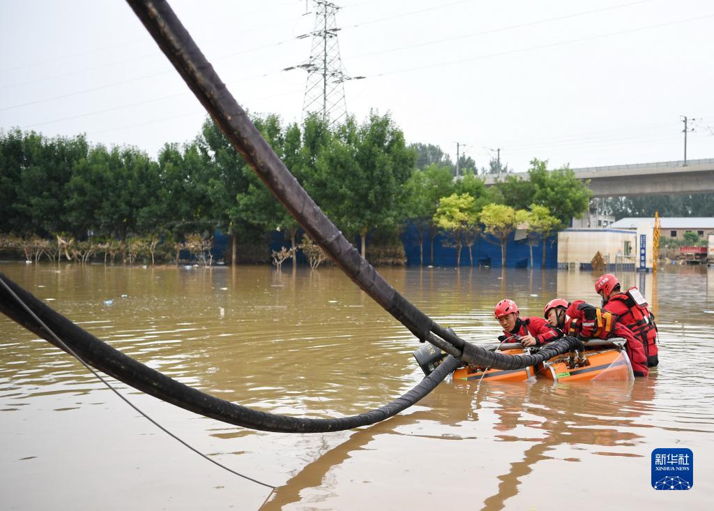 8月7日,唐山市消防救援支隊隊員在河北省涿州市市區內進行排澇作業。