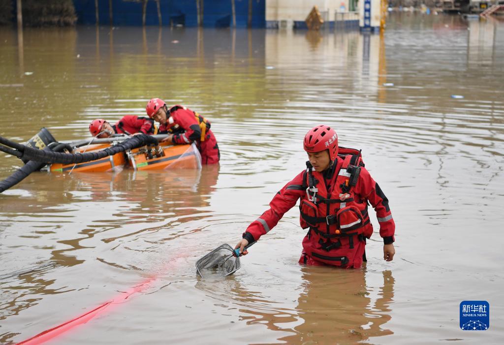 8月7日,唐山市消防救援支隊隊員在河北省涿州市市區內進行排澇作業時清理水泵附近的雜物。