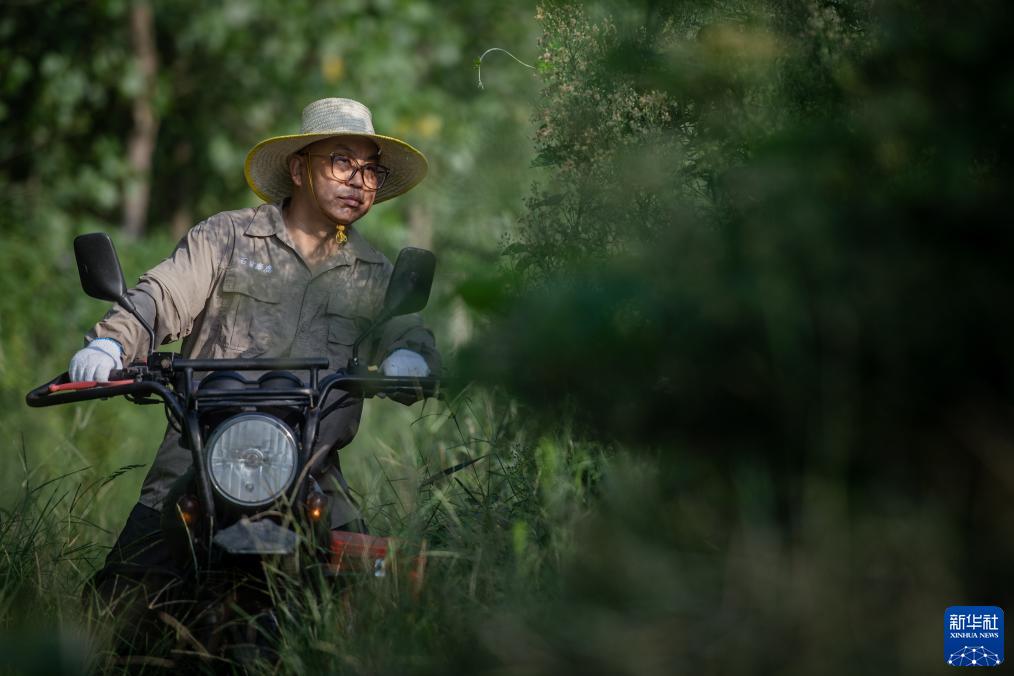 8月1日,在湖北石首麋鹿國家級自然保護區,巡護員王傳軍在騎車巡邏。由于保護區人類活動較少,巡護員們經常需要在齊腰高的野草中穿行。
