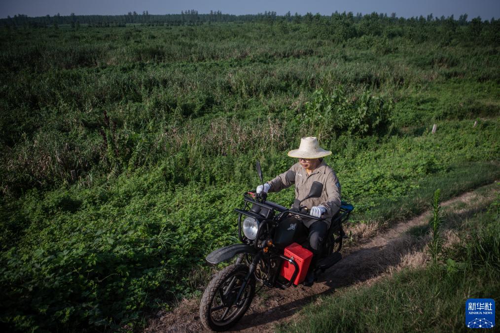 8月1日,在湖北石首麋鹿國家級自然保護區,巡護員王傳軍在騎車巡邏。