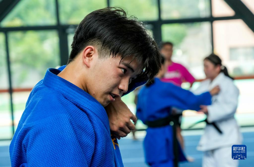 8月4日,重慶市特殊教育中心柔道隊隊員周涵訓練間隙擦汗。