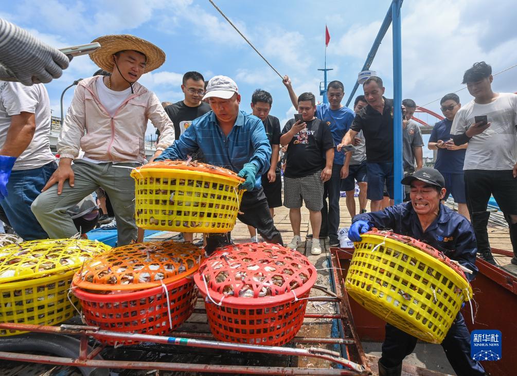 8月7日首批開漁歸來的漁運船靠泊在舟山普陀沈家門舟山國際水產城碼頭,漁民把整筐的梭子蟹運送上岸。