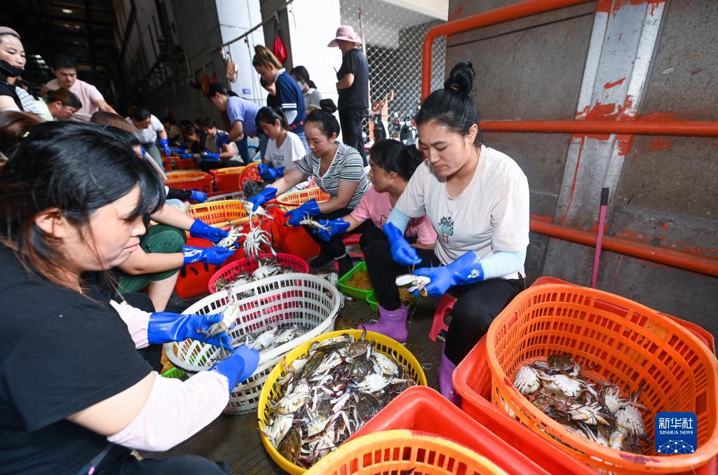 8月7日,舟山普陀沈家門舟山國際水產城的商戶們在分揀、綁扎開漁捕撈上來的首批梭子蟹,然后發往各地市場。