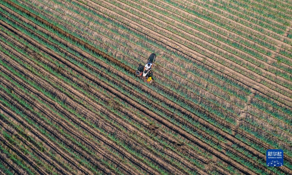 8月7日,河南省夏邑縣會亭鎮王廠村農民在給大蔥封溝(無人機照片)。