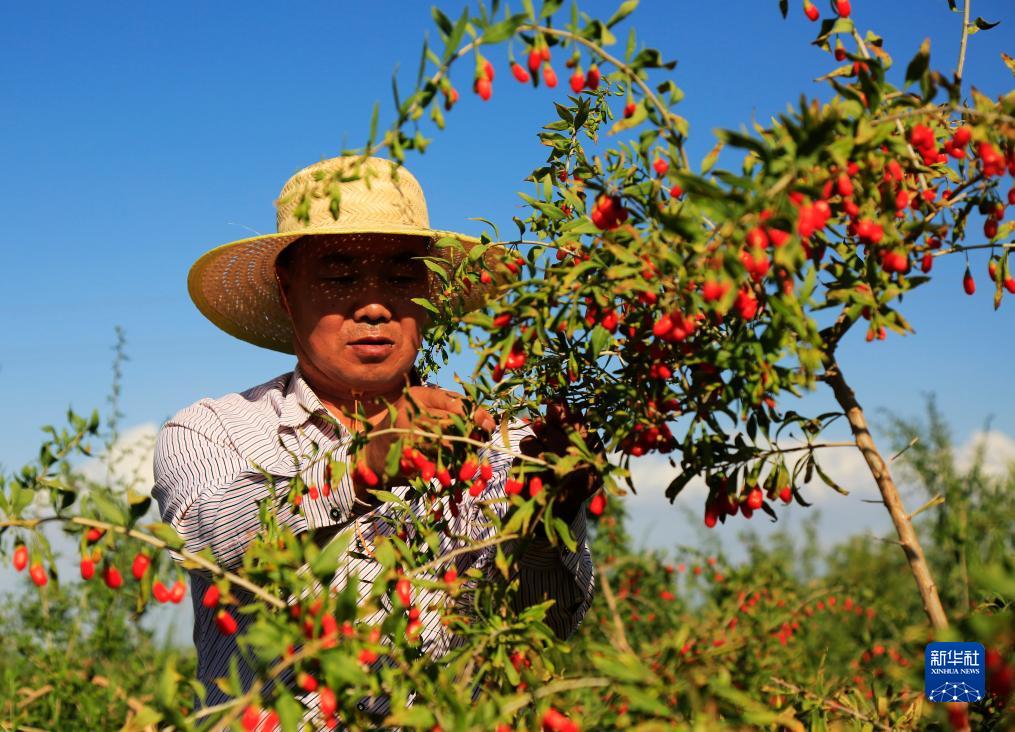 8月6日,在甘肅省張掖市甘州區安陽鄉苗家堡村枸杞基地,村民在采摘枸杞。