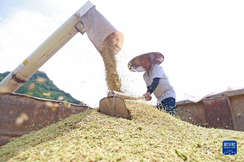 8月7日,在貴州省岑鞏縣注溪鎮六部屯村雜交水稻制種基地,村民在將收獲的水稻裝車。