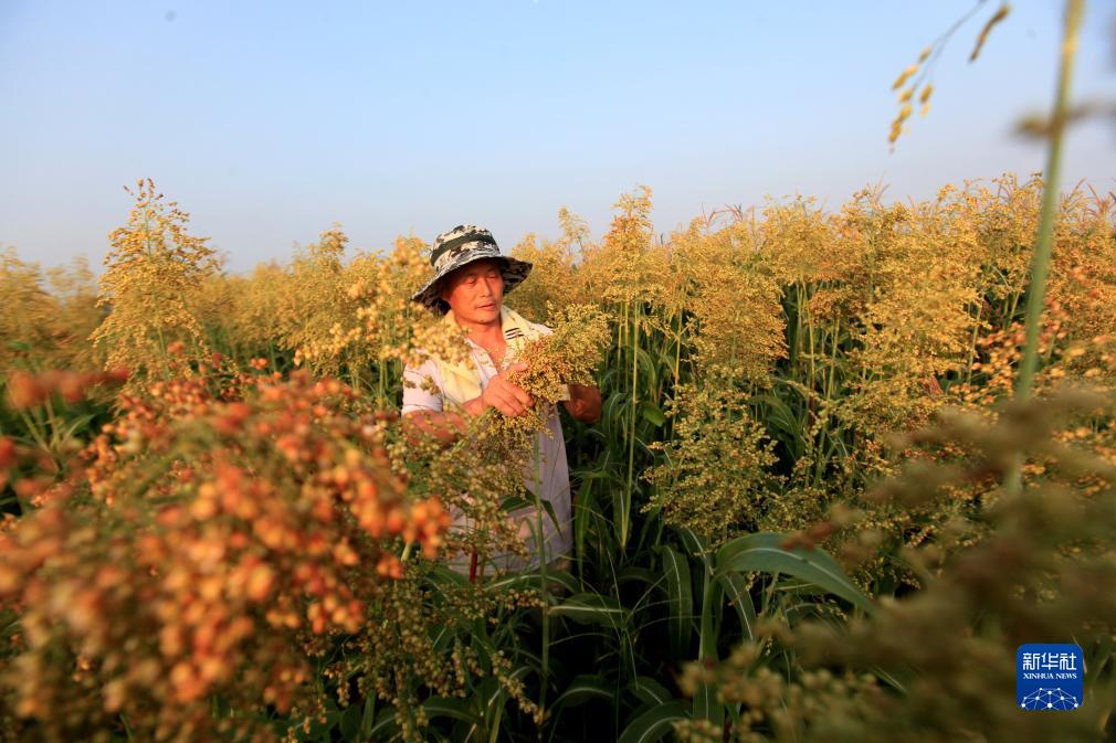 8月7日,在山東省臨沂市平邑縣地方鎮東朱尹村,村民在田間查看高粱長勢。