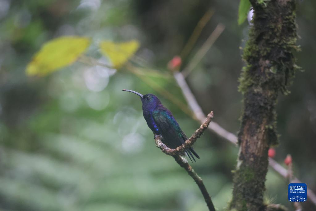 7月24日,哥斯達黎加蒙特韋德云霧森林生物保護區的一只紫刀翅蜂鳥停在林中。