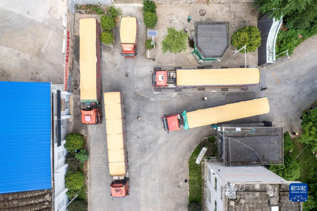 8月7日,運糧車在湖南安仁國家糧食儲備庫排隊過磅(無人機照片)。