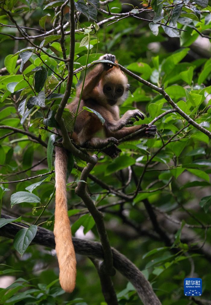 8月5日,一只小“金猴”在樹上玩耍。幼猴渾身金毛,被人們稱為“金猴”。