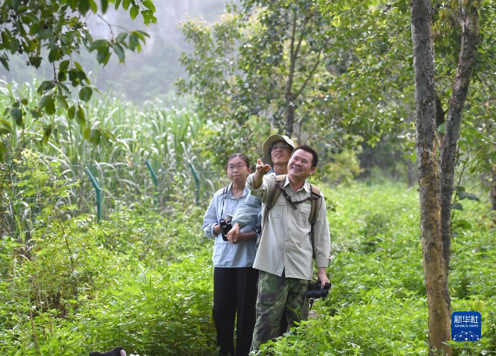 梁志章(右)、李文欽(中)和劉彥辰在觀察白頭葉猴活動(8月5日攝)。