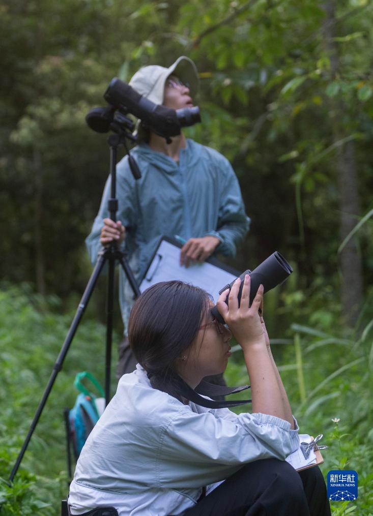8月5日,李文欽(后)和劉彥辰在觀察猴群。