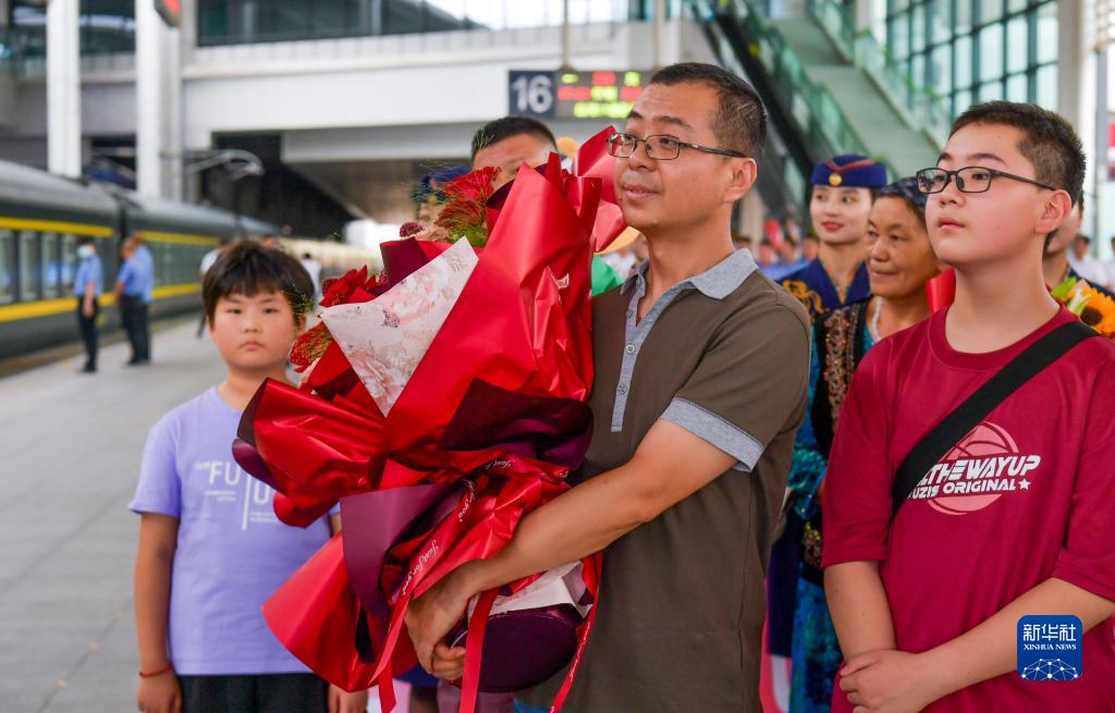 8月7日,在烏魯木齊站,Z180次列車乘務人員家屬迎接親人歸來。新華社記者 王菲 攝