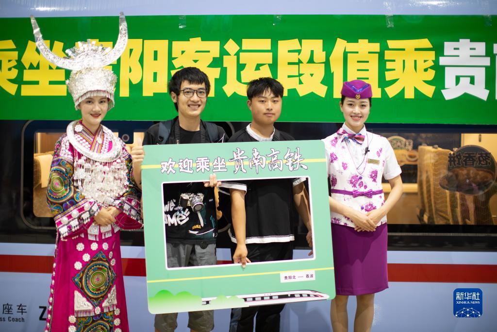 8月8日,旅客在貴陽北站和身著民族服裝的乘務員合影留念。