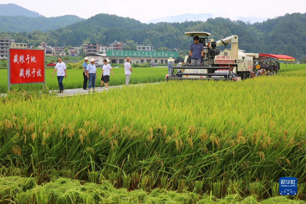 8月7日,在湖南省邵陽市隆回縣羊古坳鎮雷峰村超級雜交水稻高產攻關科研基地,農機手駕駛收割機收割再生稻。