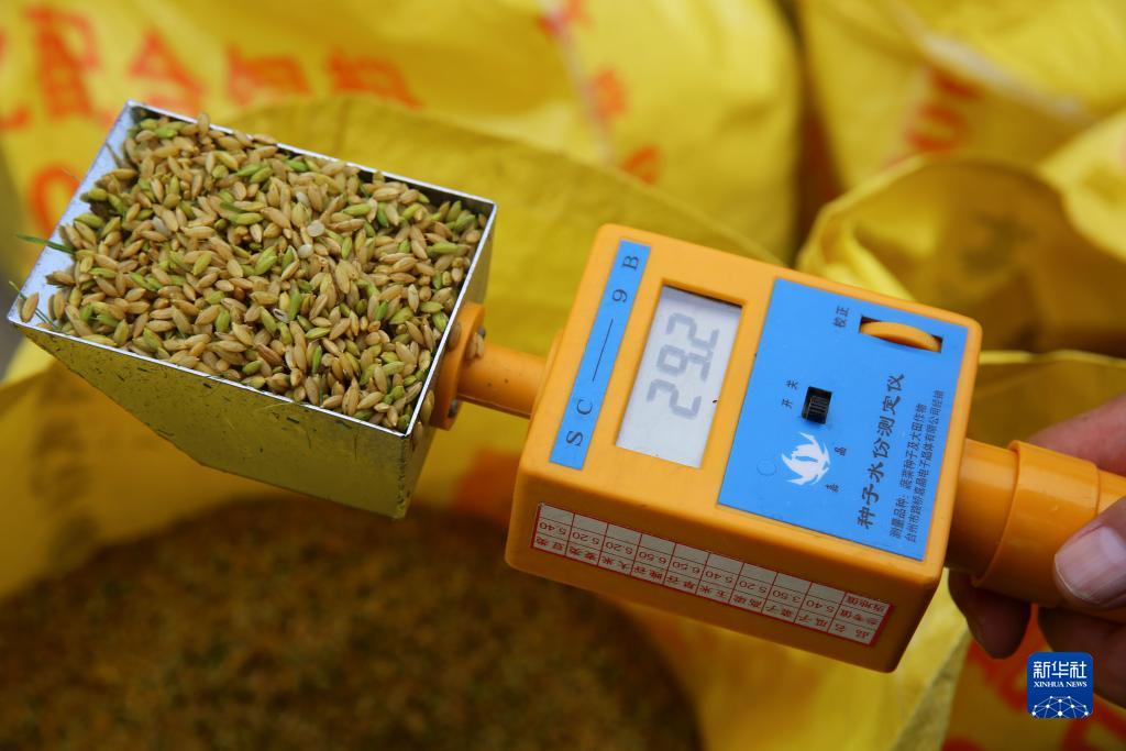 8月7日,在湖南省邵陽市隆回縣羊古坳鎮雷峰村超級雜交水稻高產攻關科研基地,技術人員測定稻谷水份。