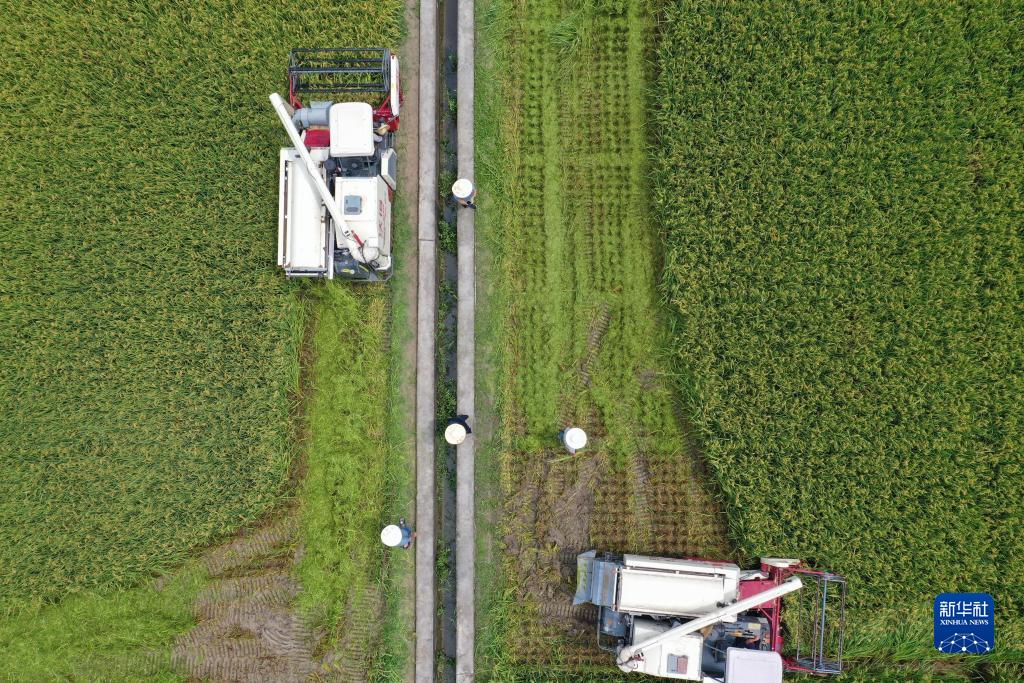 8月7日,在湖南省邵陽市隆回縣羊古坳鎮雷峰村超級雜交水稻高產攻關科研基地,農機手駕駛收割機收割再生稻(無人機照片)。
