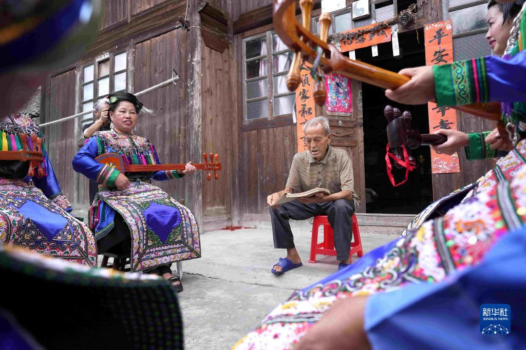8月7日,在貴州省榕江縣寨蒿鎮扒王村,81歲老歌師龍上豪(中)向青年歌師傳授民歌普法知識。