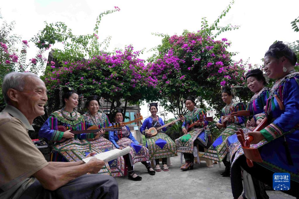 8月7日,在貴州省榕江縣寨蒿鎮扒王村,81歲老歌師龍上豪(左一)向青年歌師傳授民歌普法知識。