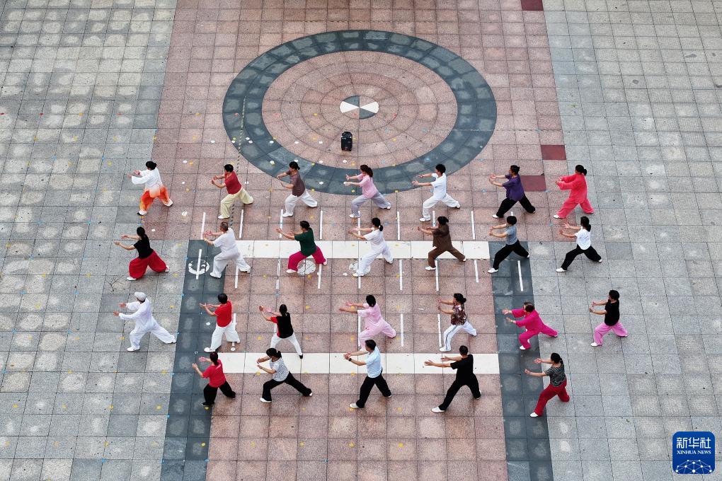 8月8日,湖南省衡陽市衡東縣文體廣場,太極拳愛好者在晨練(無人機照片)。