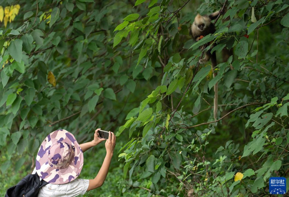 8月4日,在崇左市江州區羅白鄉的白頭葉猴國家級自然保護區,一名游客在拍攝白頭葉猴吃構樹的果實。