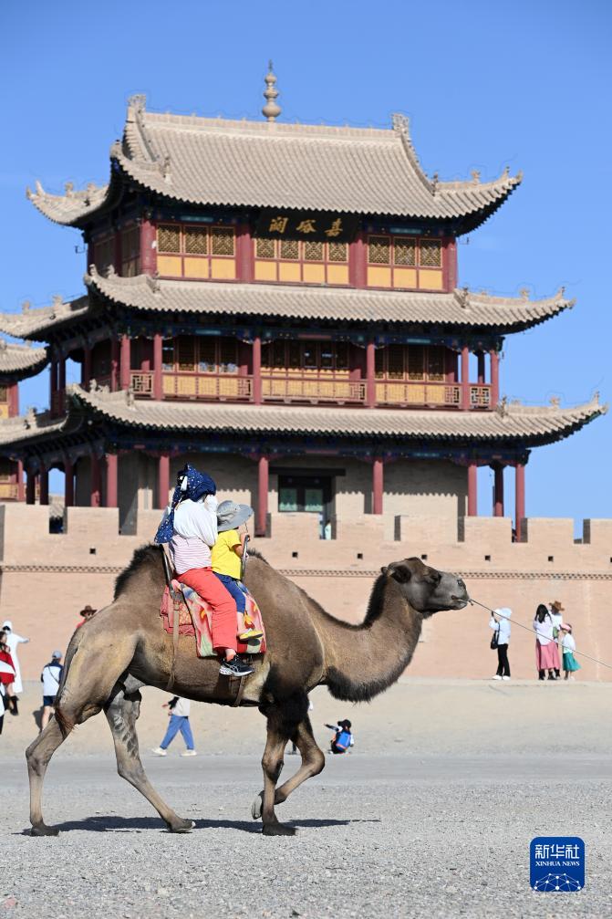 8月7日,游客在嘉峪關關城外騎駱駝。