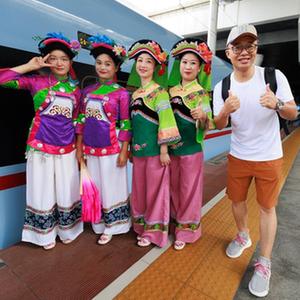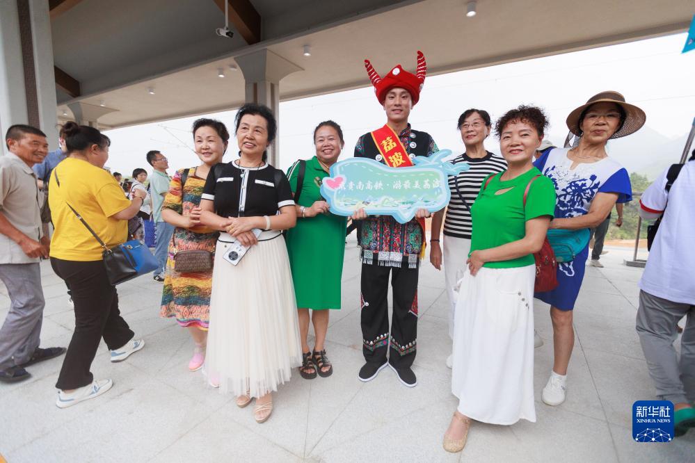 8月8日,旅客在荔波站內和身著民族特色服裝的工作人員合影。