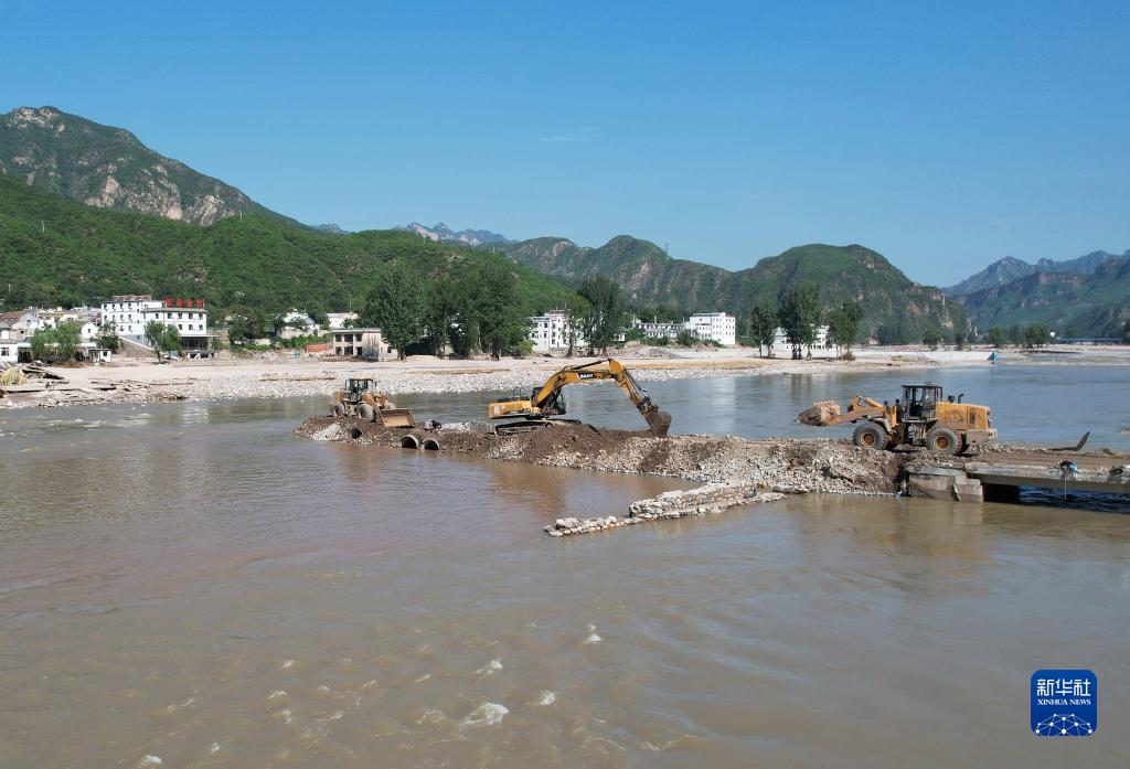 8月8日,工人操作機械設備搶修通往淶水縣三坡鎮上莊村的橋梁(無人機照片)。