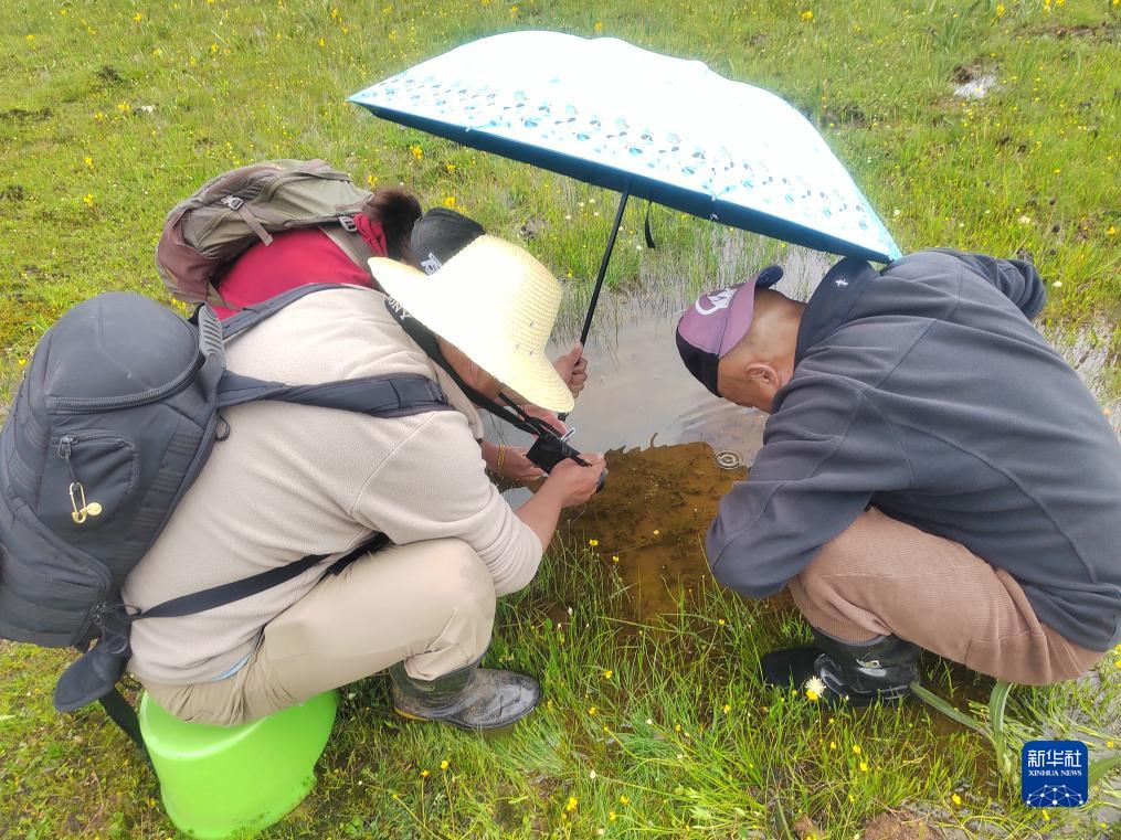 8月4日,科研人員在云南省迪慶藏族自治州香格里拉市普達措景區內拍攝高寒水韭。