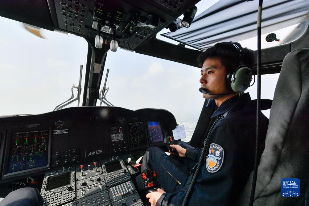 8月8日,天津市公安局警務航空總隊駕駛員在空中操縱警用直升機飛行。