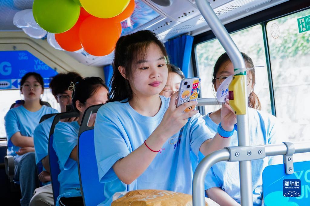 8月8日,大學生們在“青春巴士”上掃“青春有約”二維碼。